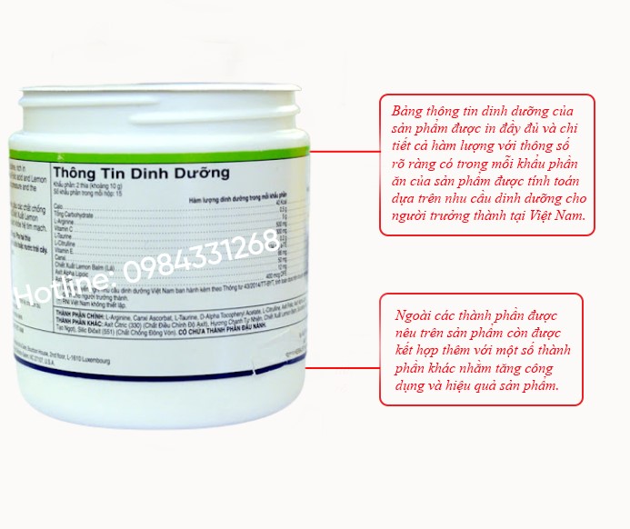 Đặc biệt chứa L-Arginine, L-Citruline để kích thích cơ thể tăng tổng hợp Nitric Oxide, ngoài ra vitamin C và E có tác dụng làm tăng hoạt tính và thời gian tồn tại của Nitric Oxide (một yếu tố rất cần cho sự bền vững của hệ thống tim mạch cũng như sức khỏe) và kháng gốc tự do mạnh.
